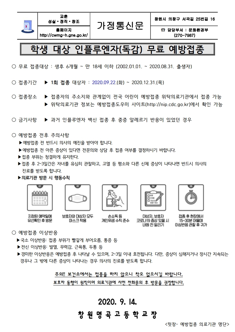인플루엔자(독감) 무료 예방접종 안내 가정통신문.hwp
