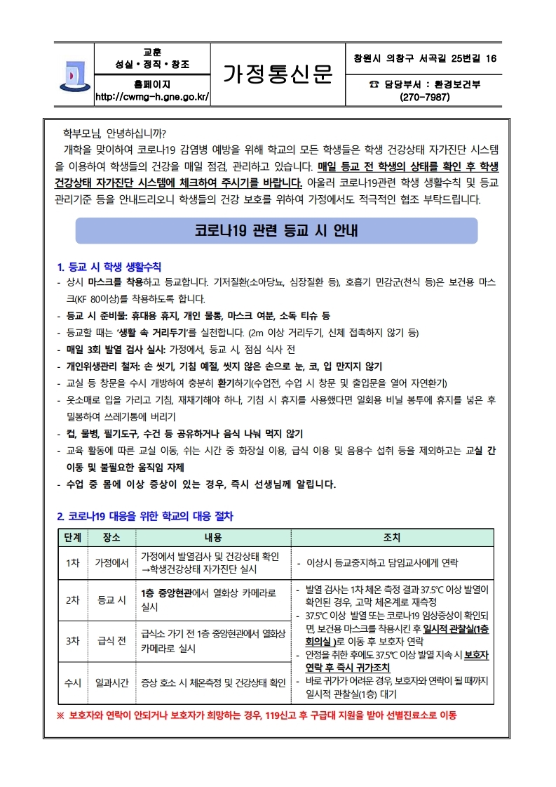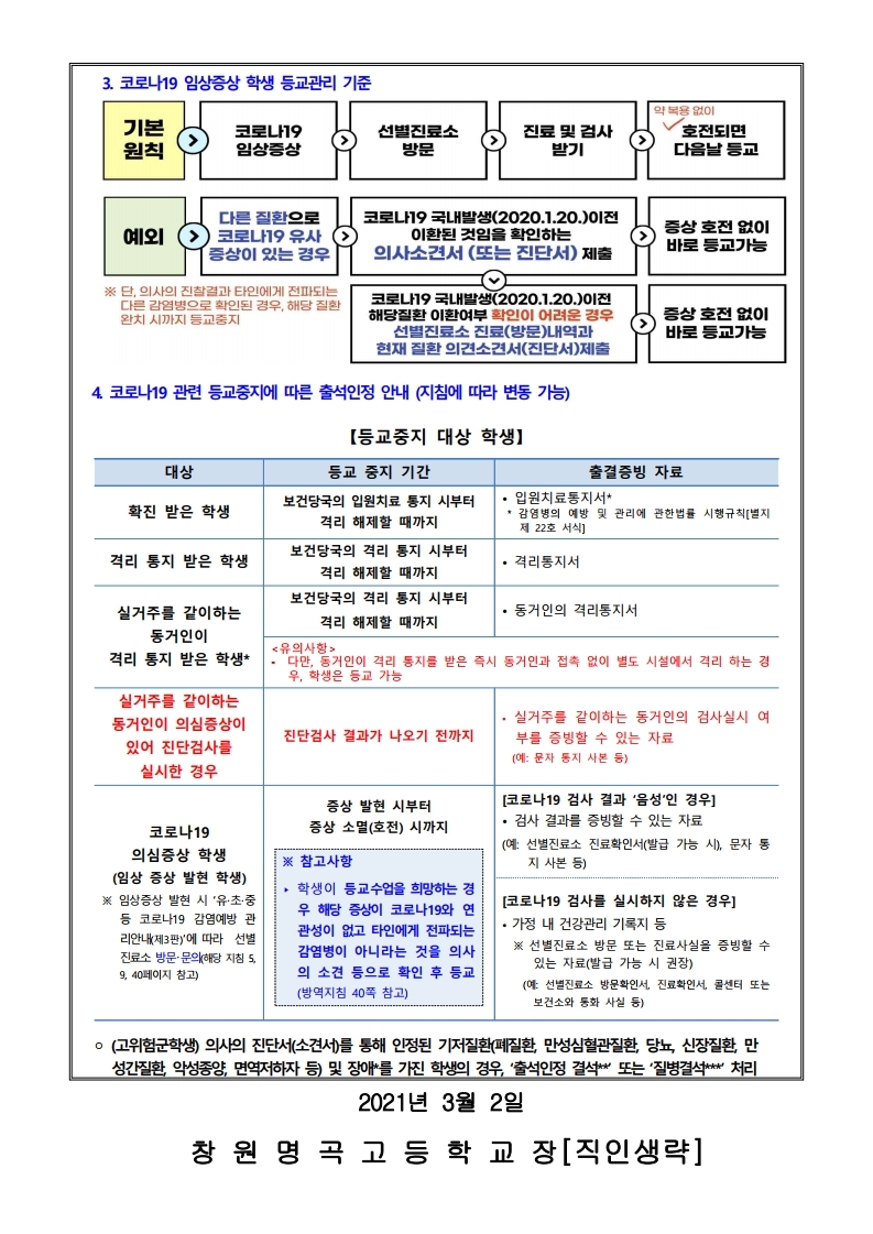 2021년 학생 코로나19 관련 안내문입니다.1. 등교 시 학생 생활수칙2. 코로나19 대응을 위한 학교의 대응 절차3. 코로나19 임상증상 학생 등교관리 기준4. 코로나19 관련 등교중지에 따른 출석인정 안내 (추가: 동거가족이 진단검사시 등교중지)