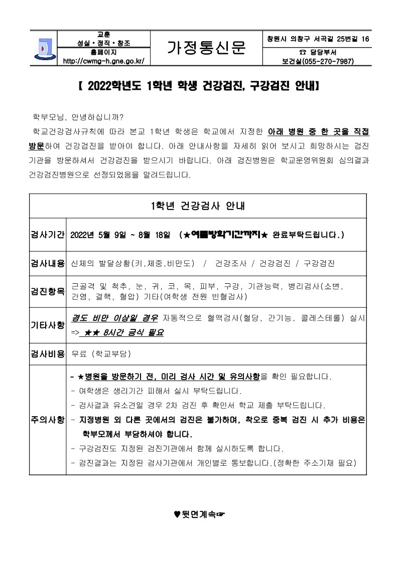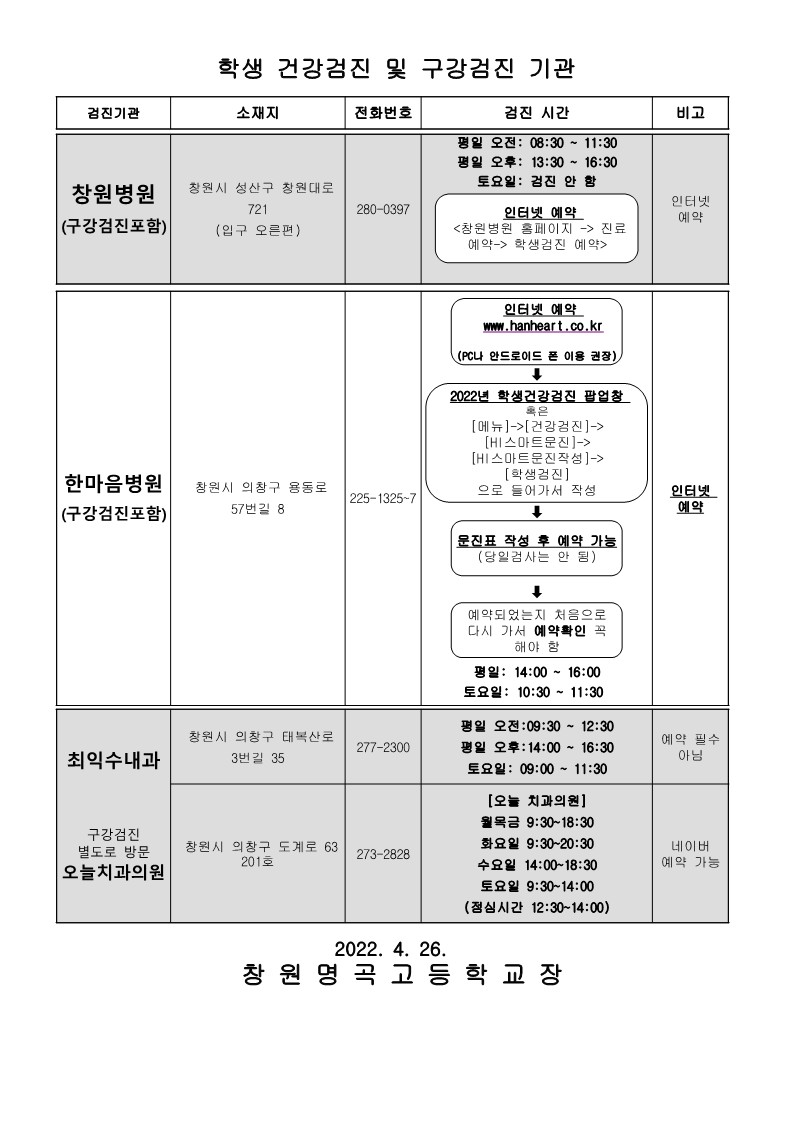 2022학년도 1학년 학생 건강검진, 구강검진 안내(수정내용: 창원병원 인터넷 예약하기)
