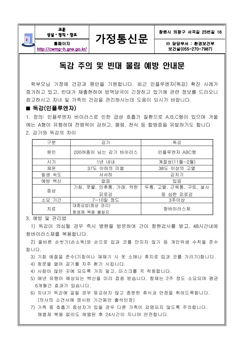 독감 예방법 및 빈대물림 주의사항 안내